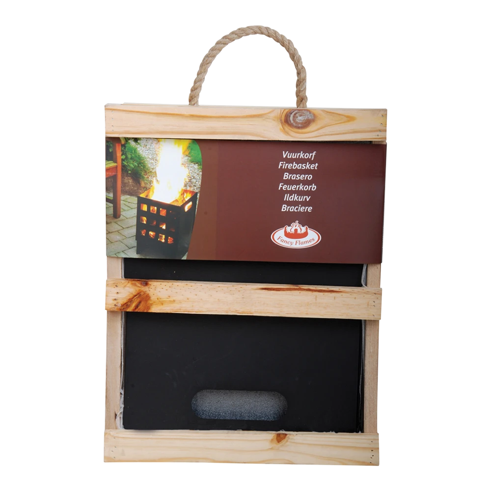 Less is more! Deze lage vierkante vuurkorf heeft een strakke uitstraling en past daardoor in iedere tuin. Bovendien is over de verpakking nagedacht, het houten krat met handvat is her te gebruiken als brandhout.